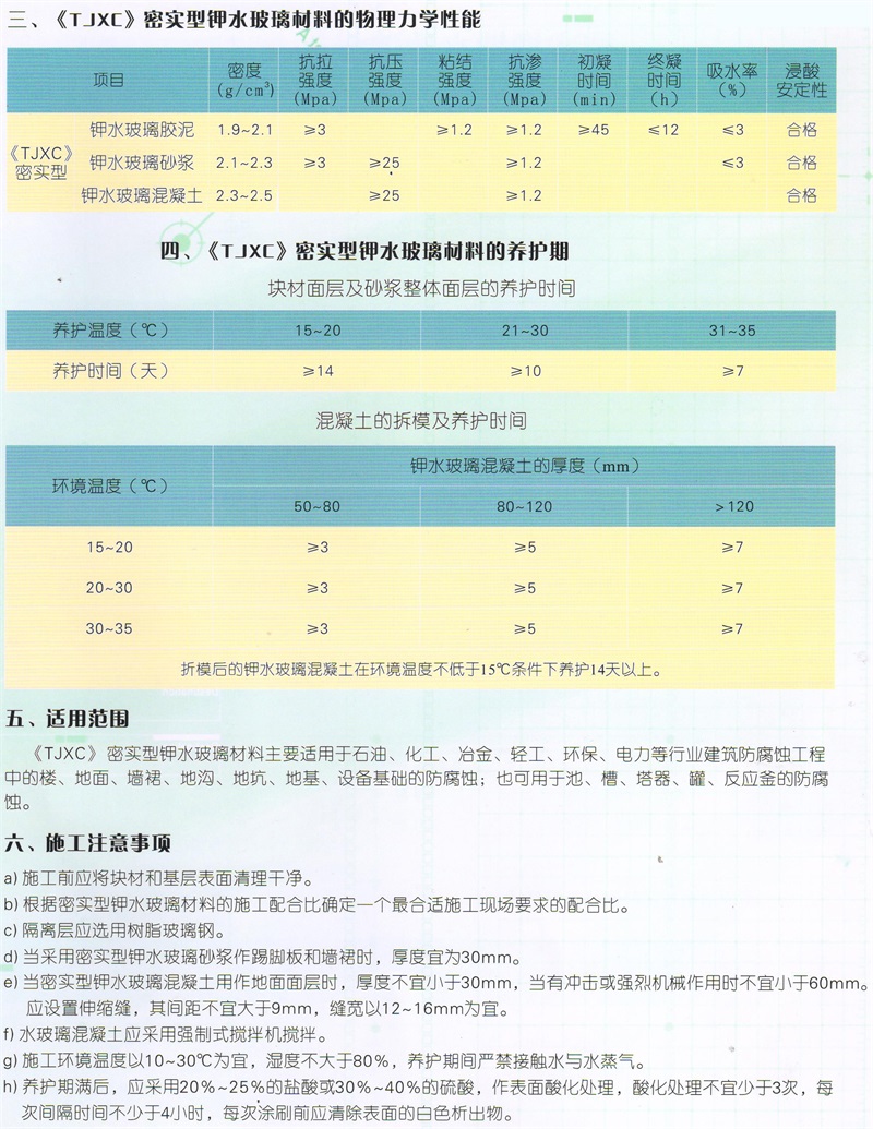特點: 1、《KPI》膠泥具有較高的機械強度,粘接力強,抗滲性好。 2、《KPI》膠泥對多種化學介質如無機酸(氫氟酸除外)氧化性酸有機酸和各種有機溶劑有較好的耐蝕性。 3、《KPI》膠泥采用了非囪素型無毒固化劑,對施工操作人員,對所接觸的介質無毒害作用,對所襯砌設備無腐蝕性。 4、《KPI》膠泥可在室溫施工,常溫固化,高溫使用,施工簡單,使用方便,貯存期長,易于運輸。 5、《KPI》膠泥具有良好的耐熱性,在某些介質中可使用300℃,亦可使用于高達800~1000℃的煙道.爐窯等高溫設備中。三、施工工藝 1、攪拌:先將干料加入攪拌機內干拌2min,再加入水玻璃、改性劑,濕拌3min 即可出料。為防止死機,攪拌量以不超過攪拌機容量的40%為宜。出料要迅速及時,若攪拌機發生故障,要及時清除機內料并用水沖洗干凈。 每日收工后,要將機內及攪拌片上的改性混凝土清洗干凈。工程量很小時,可采用人工拌合。 2、澆筑:在施工面上刷一層稀膠泥,待其固化后再澆筑,盡量避免留施工縫。必須留施工縫時,應留成斜槎,并保持粗糙面。下次接縫時,先抹稀膠泥再澆灌,接槎處應抹實抹平。 夏秋季溫度高時改性水玻璃混凝土幾分鐘即可初凝成型,所以現場搗實抹平速度要快,宜在初凝前抹出光面,一次成型,以免初凝后再抹出現皺皮而影響外觀和降低抗滲抗腐蝕性能。 3、拆模和養護:養護期間嚴禁與水或蒸汽、濃度極小的稀酸接觸。一般根據環境溫度、拆模時間和養護時間按下表執行。 改性水玻璃混凝土的拆模和養護時間